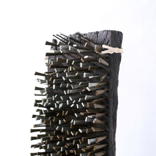 Raul draws inspiration from the Cradle of Humankind, a landscape renowned for its abundance of fossils. Fossilization occurs when layers of sediment accumulate, subjecting minerals in the ground to pressure and temperature until they crystallize into stone. Fossils, like poetry, hold a suspended time and a vertical logic. They are not explained thoughts, nor do they follow the horizontal flow of natural time, as horizons and prose do. Instead, they inhabit what Gaston Bachelard described as the “poetic instant”, a harmonic relation of opposites, where being rises or falls.
